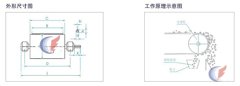 這種系列是將圓弧形的永久磁鐵固定在軸上,而 使非磁性的轉筒沿著磁鐵圓周旋轉的磁輥。 從動作原理圖上可以看出,被處理的原料從上面 供給后,磁性雜質通過磁輥的表面時就被磁鐵吸引 ,隨著轉筒的旋轉,被吸附的雜
